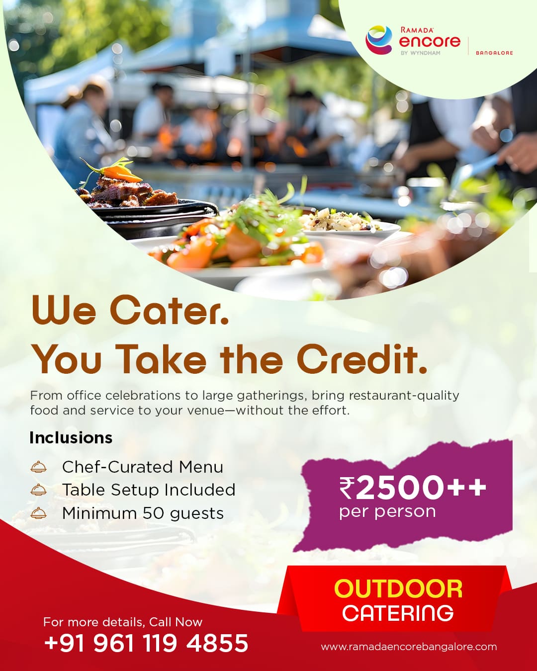 When your company needs to host an event — a team celebration, a client dinner, an annual day, a product launch — the food either elevates the occasion or undermines it. The Hub kitchen at Ramada Encore Bangalore Domlur is three minutes from the EGL main gate, and is now available as a dedicated outdoor catering service for corporate events across Inner Ring Road, Domlur, Indiranagar, and Koramangala.